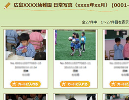 アクセスキーで認証された写真一覧画面から写真の拡大表示や写真の購入が可能です。 一覧表示された写真をクリックすると拡大した写真が表示されます。 ご注文を希望する写真は、≪カートに入れる≫をクリックすることでお買い求めいただけます。 ※≪カートに入れる≫をクリックした時点でご注文は確定しません。 |